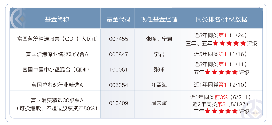 数据来源:富国蓝筹精选股票(QDII)人民币、富国中国中小盘混合(QDII)、富国消费精选30股票A的同类排名数据来自MorningStar,截至2025-08-31,同类产品分别为中国开放式基金-QDII大中华区股票、中国开放式基金-QDII大中华区股债混合、中国开放式基金-行业股票-消费;该数据由MORNINGSTAR版权所有,晨星及其内容供应商对于您使用任何相关资料而作出的任何有关交易,投资决定均不承担任何责任。过往业绩不代表将来表现。富国沪港深业绩驱动混合A、富国沪港深行业精选A的同类排名数据来自银河证券,截至2025-08-31,同类产品分别为港股通偏股型基金(A类)、港股通灵活配置型基金(A类)。